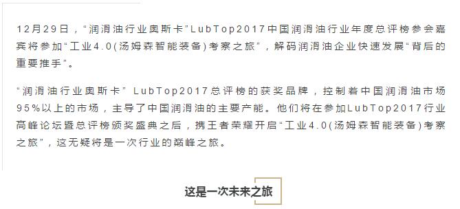 【潤滑油行業(yè)總評榜】江蘇湯姆集團獨家冠名Lubtop2017潤滑油總評榜,與您共登方舟,助您快速駛向工業(yè)4.0!